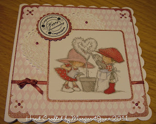 I've used a fab die cut image from LOTV and tried to pick up the pinky red tones with Pink Petticoat leaf print paper, dark pink 'Gemstones' backing card from Co-ordinations, a few pearls and ribbon from my stash and to keep the love theme going I included a doily heart. The sentiment is a freebie download from Nettie's blog - Thank you Annette! The little bow isn't quite as crooked as it appears on the photo but it did look a bit sad despite my best efforts with my bowmaker.